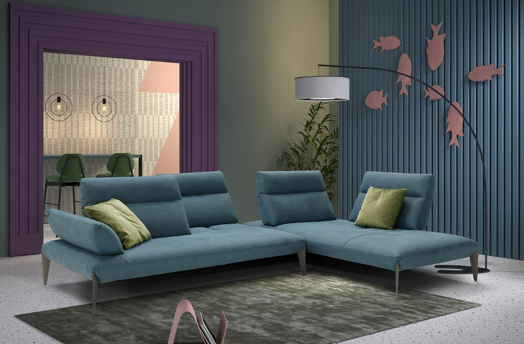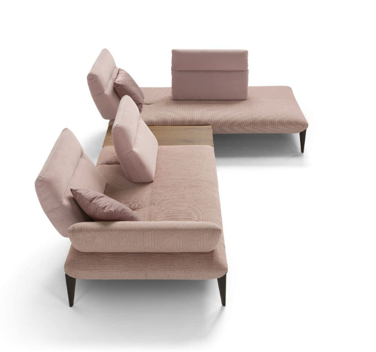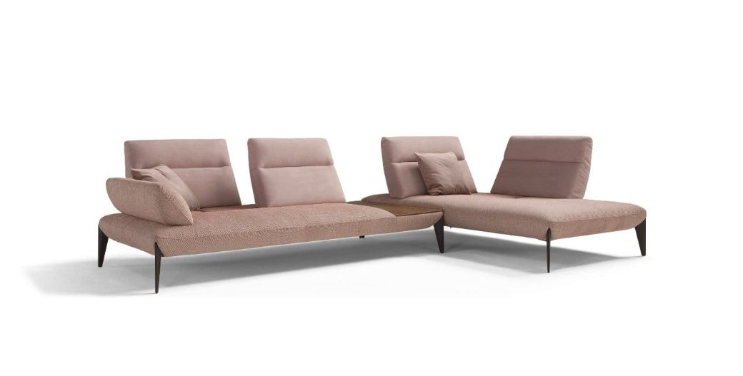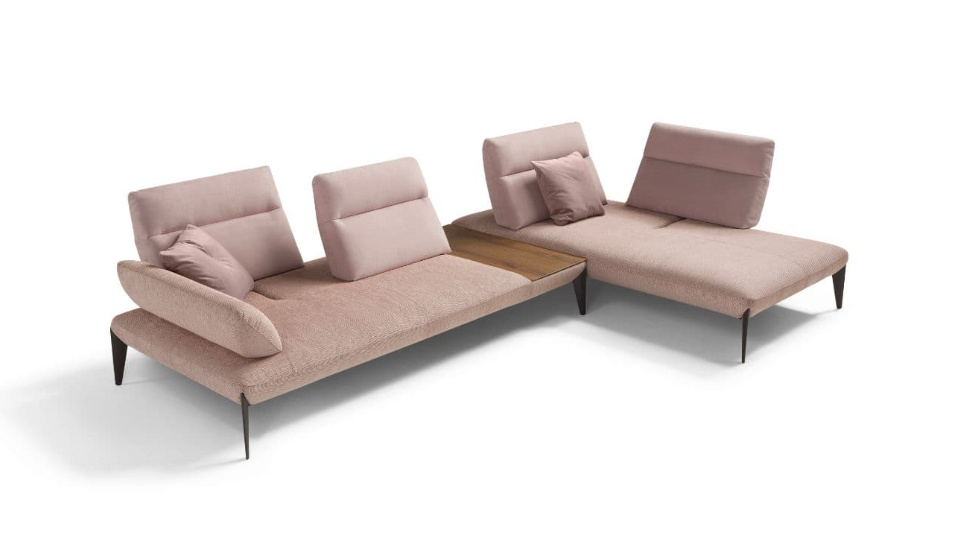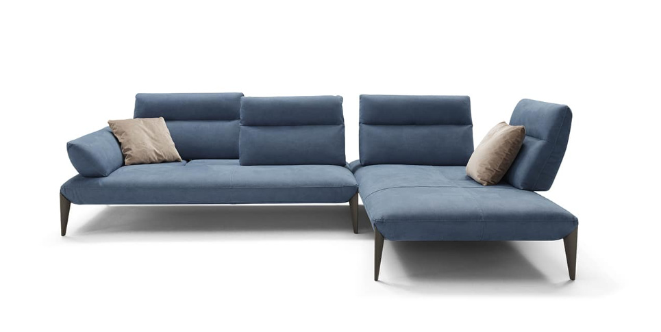 Geometrické kovové nohy zeštíhlují pohovku a hrají si s diagonálními liniemi sedadel. Ruční vyklápění opěradel umožňuje hluboké prodloužení sedáku pro dokonalou relaxaci.