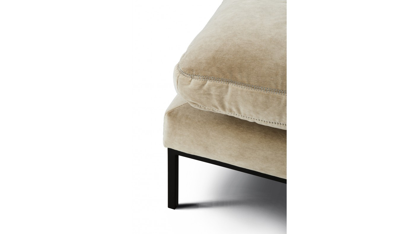 Kovové police - jedna z nich funguje jako loketní opěrka a druhá se nachází v zadní části rohové pohovky a je ideální pro ukládání různých předmětů. Police mohou být na zvláštní přání povrchově upraveny korkem, PVC pryží nebo kůží.